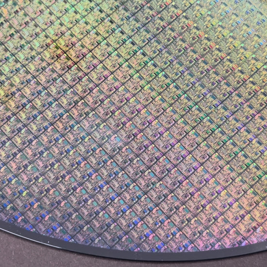 This one of a kind display contains a rare 200 mm (8 inch) finished uncut silicon wafer with an average node size of 0.18-0.11μm (micron) and up. The wafer shows a multiple colors with an depending on lighting.