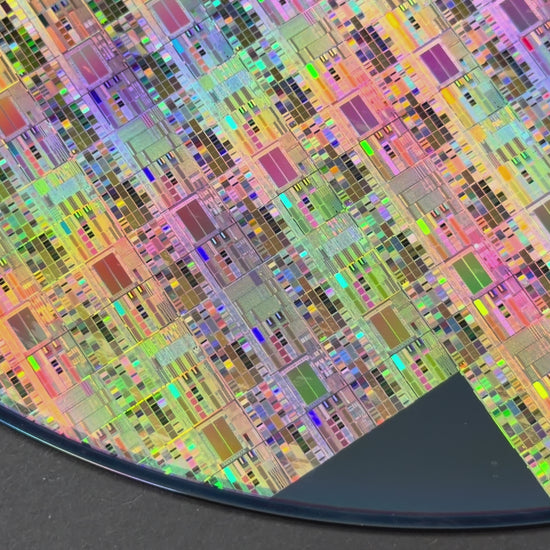This one of a kind display contains a rare 200 mm (8 inch) finished uncut silicon wafer with an average node size of 0.18-0.11μm (micron) and up. The wafer shows a multiple colors with an depending on lighting.