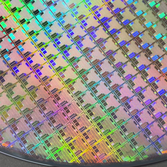 This one of a kind display contains a rare 200 mm (8 inch) finished uncut silicon wafer with an average node size of 0.18-0.11μm (micron) and up. The wafer shows a multiple colors with an depending on lighting.