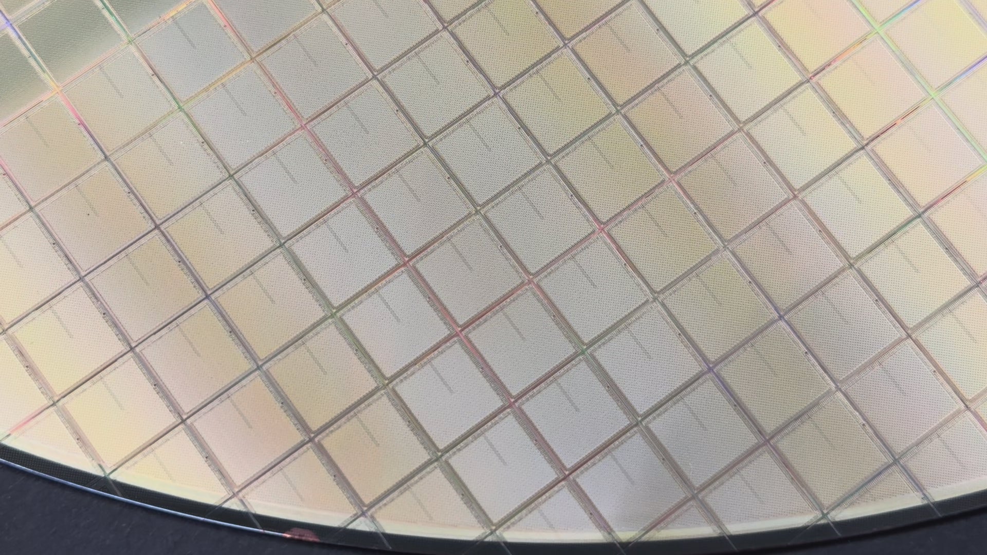 This is a rear flip chip wafer. Flip-chip is an interconnect scheme, providing connections from one die to another die or a die to a board. It was initially developed in the 1960s.