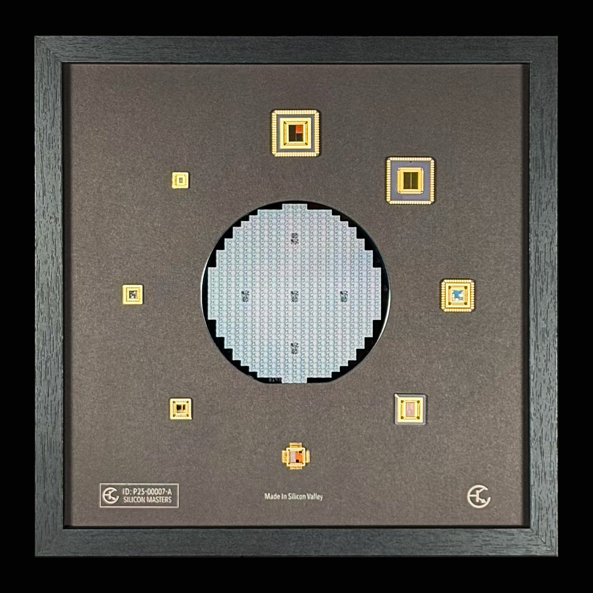 Each framed display contains a unique wafer and we do not specify the chip type or exact node size.