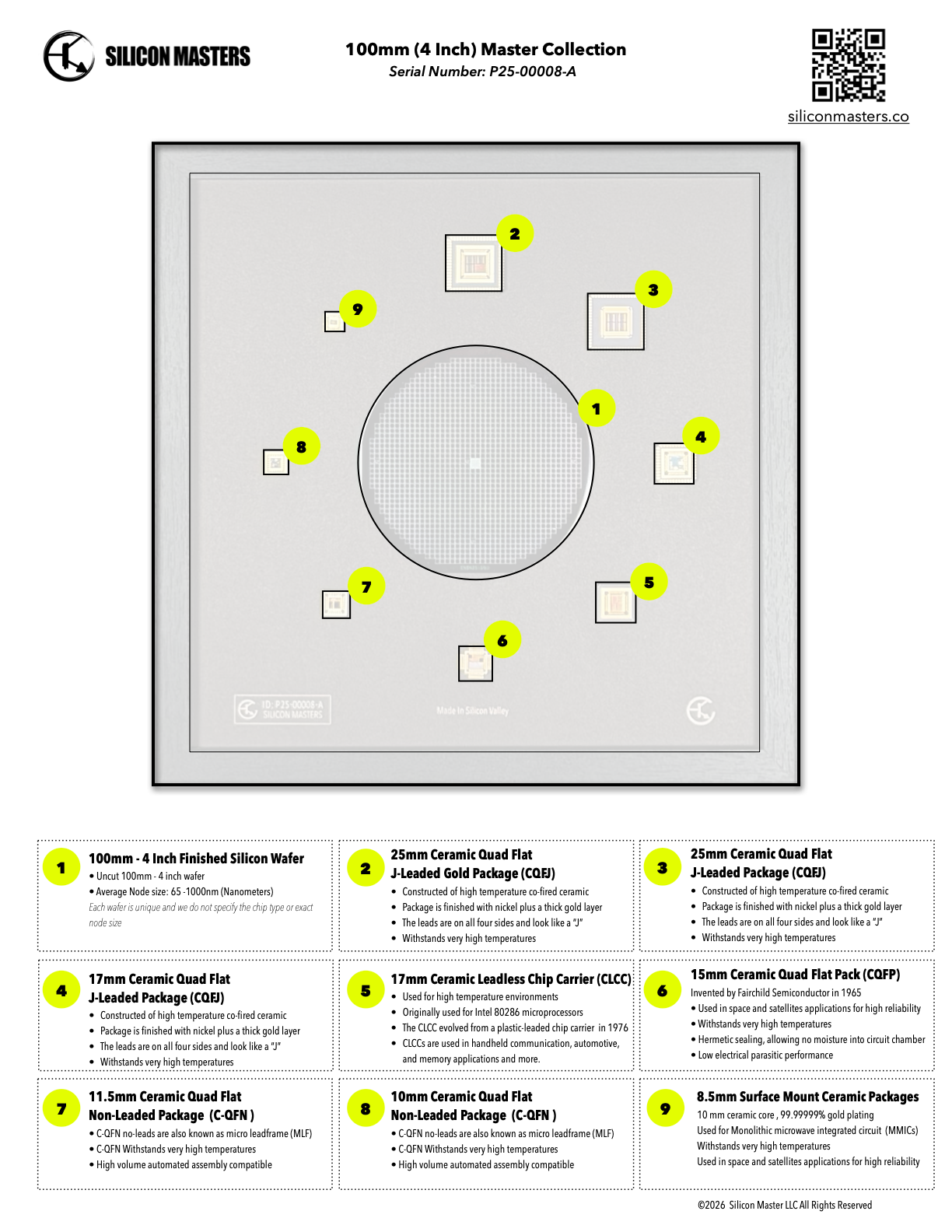 Framed Silicon Wafer: 100mm Master Collection with Gold-Plated Chip packages